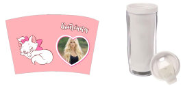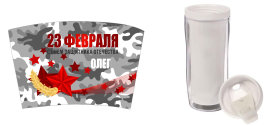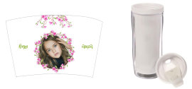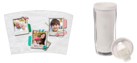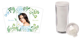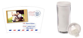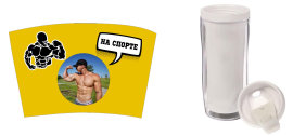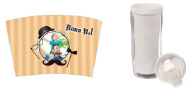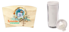Стакан-тумблер состоит из внешнего прозрачного подстаканника и вставляющегося внутрь стакана. Между ними помещается полиграфическая вставка - это может быть любое фото, коллаж или изображение с рекламой Вашей фирмы.